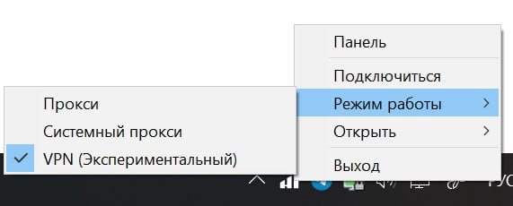Опционально: Найти в трее ПК (правый нижний угол рядом с часами) иконку приложения, нажать на нее правой кнопкой мыши и выбрать: “Режим работы” > “VPN (Экспериментальный)” или “VPN сервис (Экспериментальный)”