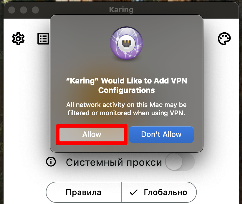 - на MacOS - позволить приложению добавить новый ВПН-профиль в настройки системы