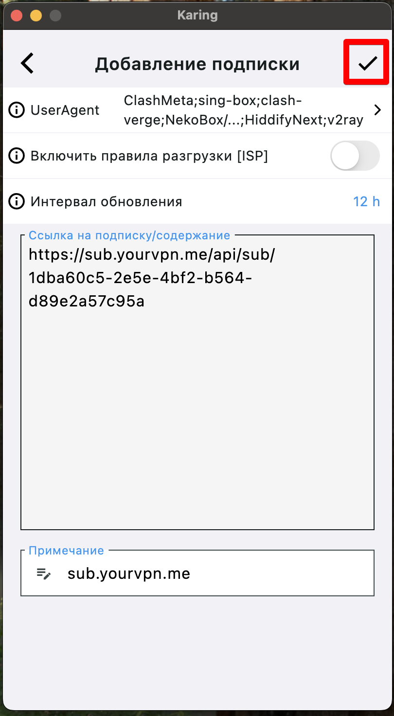 - Пролистать список до места где будет указано названиие подписки, обычно это “sub.yourvpn.me”