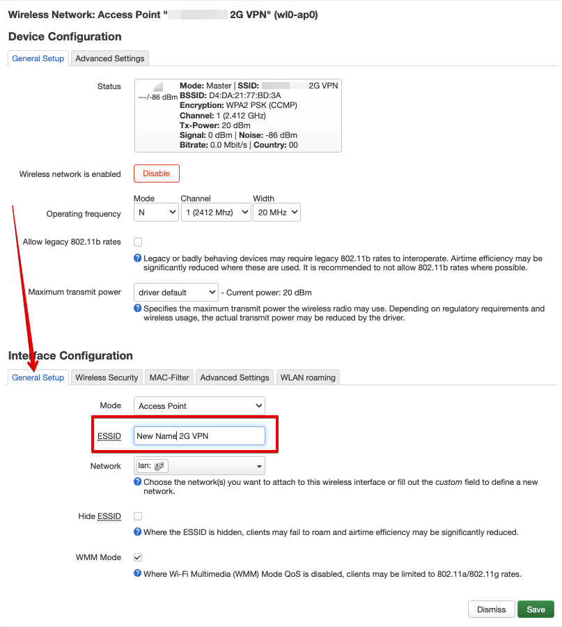 После нажатия на кнопку “Edit” откроется модальное окно настроек выбранной Wi-Fi сети. Новое название необходимо указать в поле “ESSID” на вкладке “General Setup” в блоке “Interface Configuration”